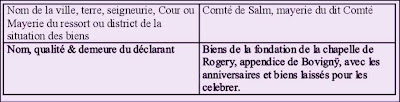 mise-à-jour 19/09/20 1) Les biens cédés par la fondation en 1714 : - Un champ gisant sur les Kannés ( ?) tenant dessus à François JACOB et dessous aux prairies, 1/2 journal. - une prairie "Dessous le village" tenant dessus à Jean PAULUS et dessous à Jean RICHELLE, déchargeant une charté de foin. - une prairie gisant "à Courtil do bache" tenant dessus à Jean BASTIN et dessous à Pierre HENNE, déchargeant 1/2 charté de foin. - une prairie gisant "o prés des gottes" tenant dessus à François BASTIN et dessous à Jean RICHEL, déchargeant 1/2 charté de foins. - deux prairies appellées les deux aisances au village" déchargeant 2 chartés de foins. - un pré "au petit passage" déchargeant 1/2 charté de foins, tenant dessus à Anne BAILHOMME et dessous à la faigne allant … . - une prairie "dessous le village" tenant dessus à Anthoine RENARD et dessous à Anthoine DELPLANCHE. - une autre tenant dessus à Jean RICHEL et dessous à vefve Georis COLLIN. - un morceau de jardin tenant dessus à Jean PAULUS et dessous à Jean BASTIN. - un champ gisant "a liette" d’1/2 journal tenant dessus à PITER de Petit-Thier et dessous à Jean MATHIEU de Honvelez. - 1/2 journal fief gisant "alhedefys" tenant dessus à Henry RICHEL et dessous à Pierre REMACLE. - un champ situé "derrière les jardins" fief tenant dessus à … CLOSE de Honvelez et dessous à Jean MATHIEU. - un champ fief "dessus la maison COLLIGNON" de 1/2 journal, joignant dessus à Anne DUCHAINNE et dessous à Jean Aubinet PAULUS. - un champ gisant "au bas du Ruhet" tenant du dessus à Henry JACOB et dessous aux prairies. - un champ … tenant dessus à Jean DEMONTY et dessous à François RUTHE . 2) biens cédés par Jean VINCENT, vaicaire de Rogery, en 1724.